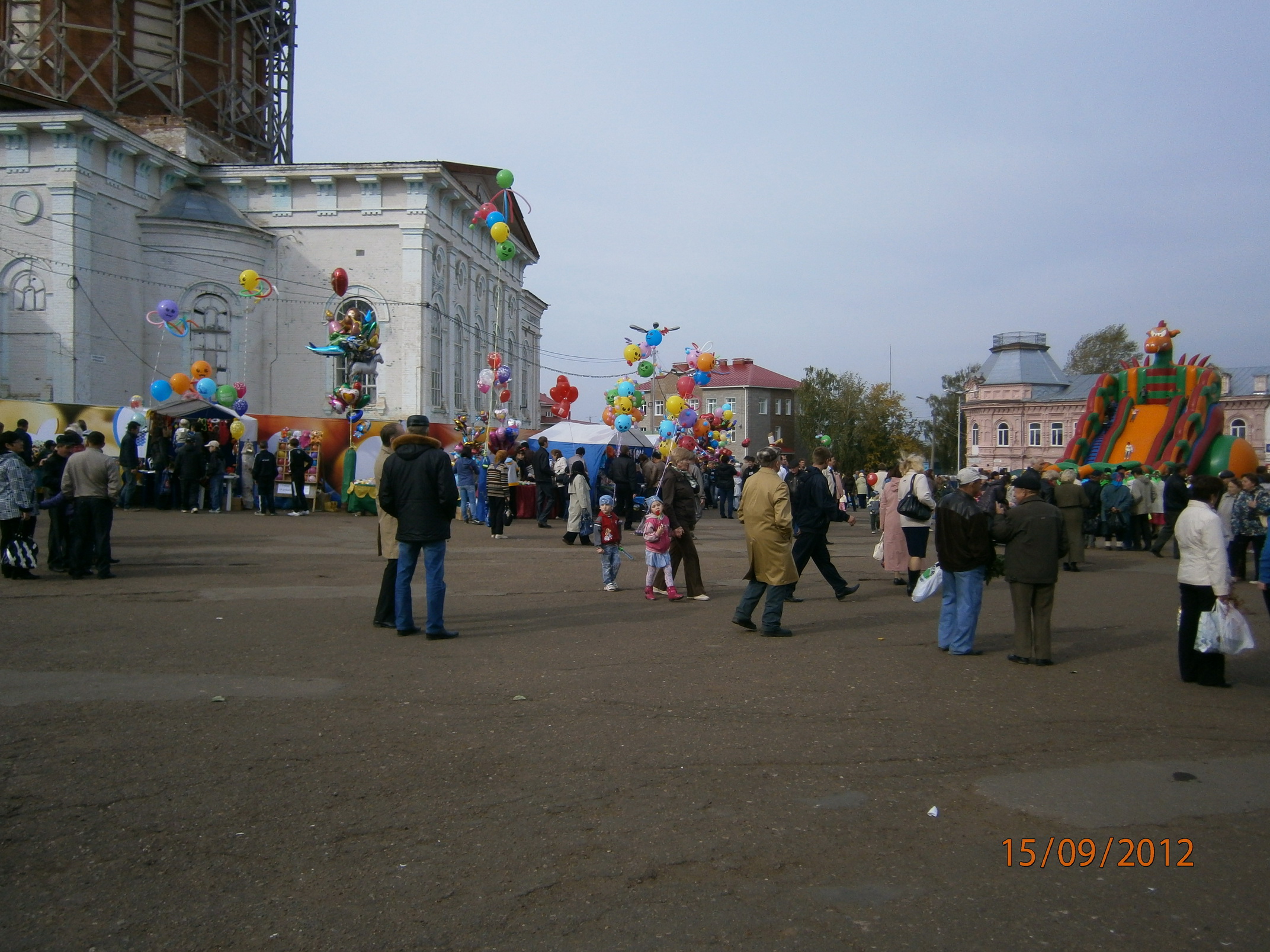15 сентября поехали в Бирск на праздник «Бирское яблоко». Заодно попали как оказалось и на день города. С Уфы до Бирска доехали за час. По спидометру прошли ровно 100км. Ехали по объездной затона, потом свернули направо в сторону первушино, потом налево в сторону Бирска. Въехав в город, попали на какой то рынок. Там перекусили чуть-чуть. И двинули в центр на праздник. Территория праздника была ограничена двумя улицами — Мира и Ленина. Оставив машину поближе к площади, двинули дальше пешком. К сожалению программы праздника мы так и не нашли. Неясно было и где проходил праздник бирского яблока, пока случайно не зашли в спорт комплекс, где собственно и проходило всё. На площади же праздновали день города — 349 лет Бирску.