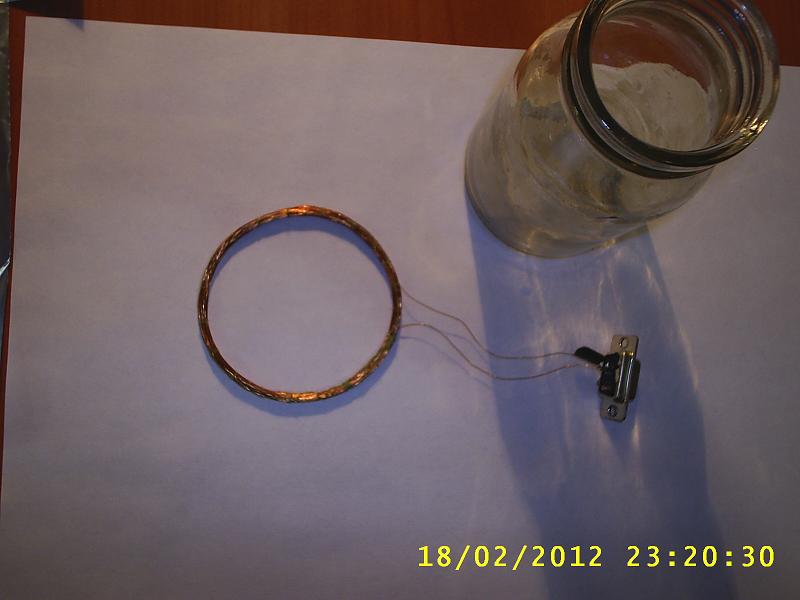 Далее поверх фольги укладываю облуженный провод и опять фиксирую нитками. Готовую катушку приклеил к форме вырезанной из прозрачного CD диска (обычно лежат с CD в самом низу и сверху). Остаётся закрыть сверху такой же формой.